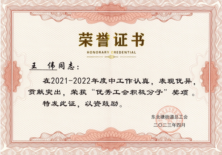 王偉同志榮獲“2021-2022年度東北塘街道優秀工會積極分子”稱號。