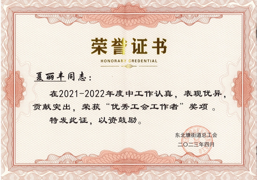 夏麗豐同志榮獲“2021-2022年度東北塘街道優秀工會工作者”稱號。